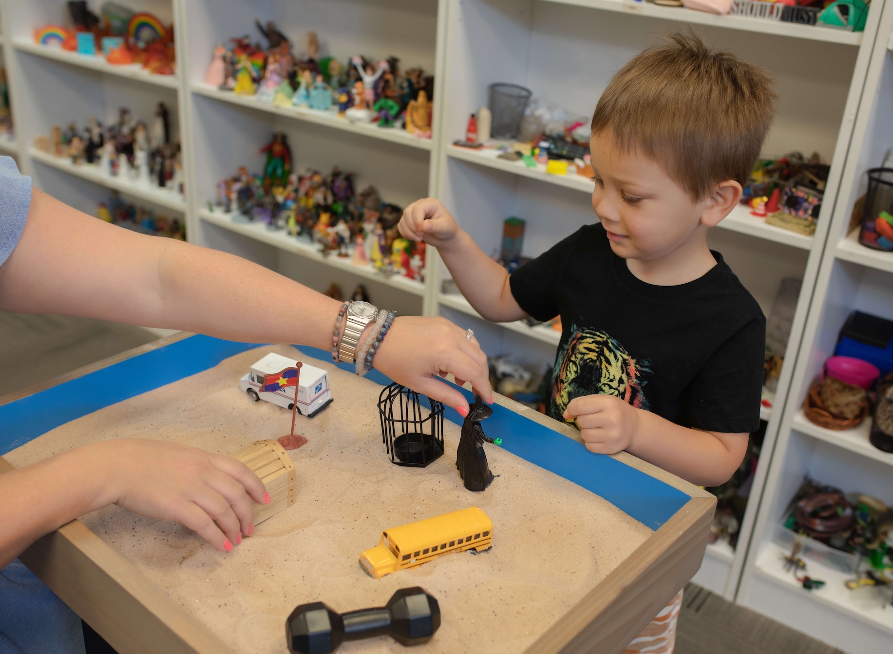 A helpful rule of thumb: the messier the sand, the deeper the tray should be. Kinetic sand, for example, gets everywhere. While it drives me a little crazy, I would never remove it from my sandtray room—especially when working with children. Kids love it. Adults, on the other hand, usually won’t touch it.
